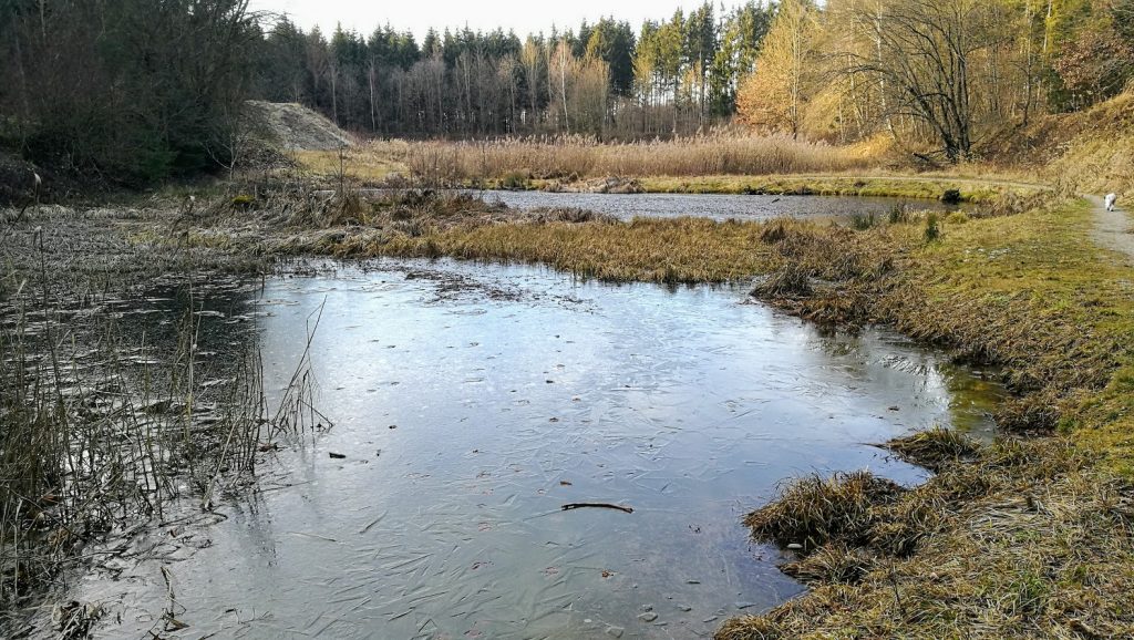 180 Meter nach dem nächsten Wörnbrunner Geräumt (also insgesamt 1,38 Kilometern) biegen wir rechts in den Waldweg ein, der uns nach einer sanften S-Kurve zur Freifläche mit den Tümpeln bringt. Hier lassen sich Frösche, Kröten und mit etwas Glück auch Ringelnattern beobachten.