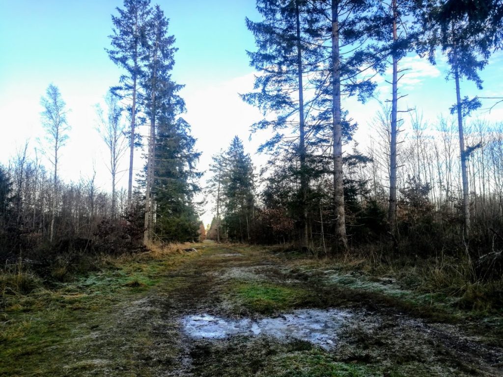 Gleich an der nächsten Möglichkeit biegen wir rechts in einen Fußweg ab, der nordwestlich abbiegt und nach 130 m auf das Harthauser Geräumt zu stoßen. Die schnurgeraden Wege durch den Perlacher Forst werden im Forstwesen als „Geräumt“ bezeichnet, was bedeutet, dass sie einst von Wurzeln und Holz befreit wurden. Nach jeweilst 400 Metern kreuzen wir das „Diensthütten-“ und Brunnen- Geräumt.
