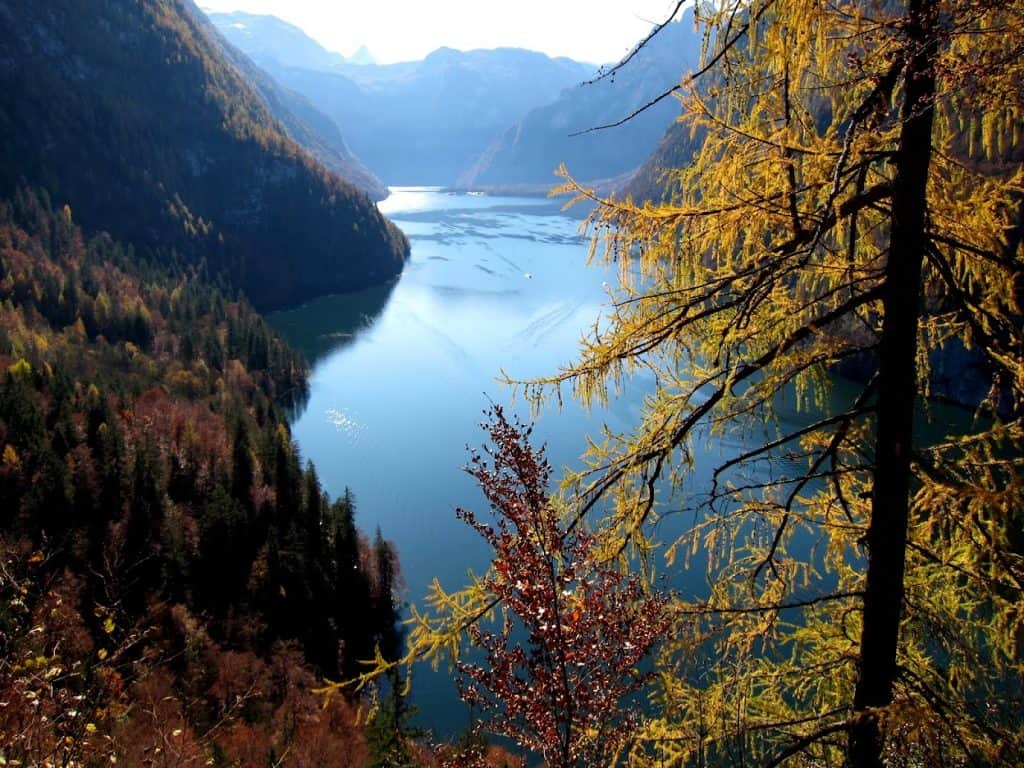 Der Königssee liegt eingebettet zwischen steilen Felswänden im Nationalpark Berchtesgaden – tief, klar und still. Gerade im Herbst, wenn sich das Licht verändert und die Wälder rundherum bunt leuchten, erinnert die Landschaft an einen norwegischen Fjord.
