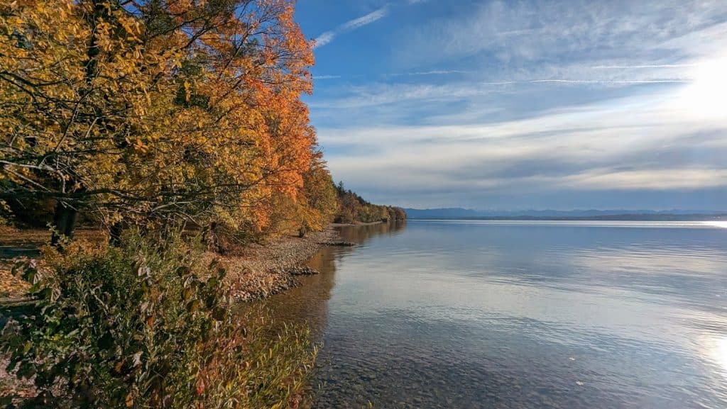 Der Starnberger See ist deutlich kleiner als der Vänern in Schweden – aber das Gefühl passt: breite Wasserflächen, ufernahe Wege, viele Laubbäume und eine offene, leicht bewegte Kulturlandschaft.
