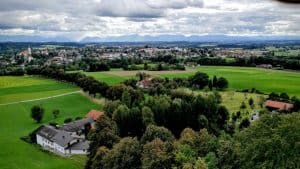 Vorne Ebersberg, rechts ein See, hinten Wald, unten Brotzeit und Museum